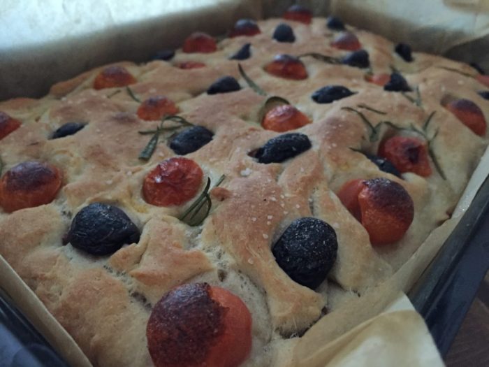 Lämmitä vesi kädenlämpöiseksi ja sekoita hiiva veteen. Lisää suola, sokeri ja öljy. Vatkaa ja lisää jauhot. Jätä taikina kohoamaan, puolisen tuntia. Öljyä uunivuoka (noin 30x40 cm) ja taputa taikina vuokaan. Laita päälle täytteitä valintasi mukaan; kirsikkatomaatteja, oliiveja, murskattua valkosipulia, tuoretta rosmariinia, sormisuolaa. Kohota vielä hetken verran. Paista noin puoli tuntia, 200´C. Valmiin leivän päälle voi halutessaan lorauttaa oliiviöljyä ja lisätä rucolaa.